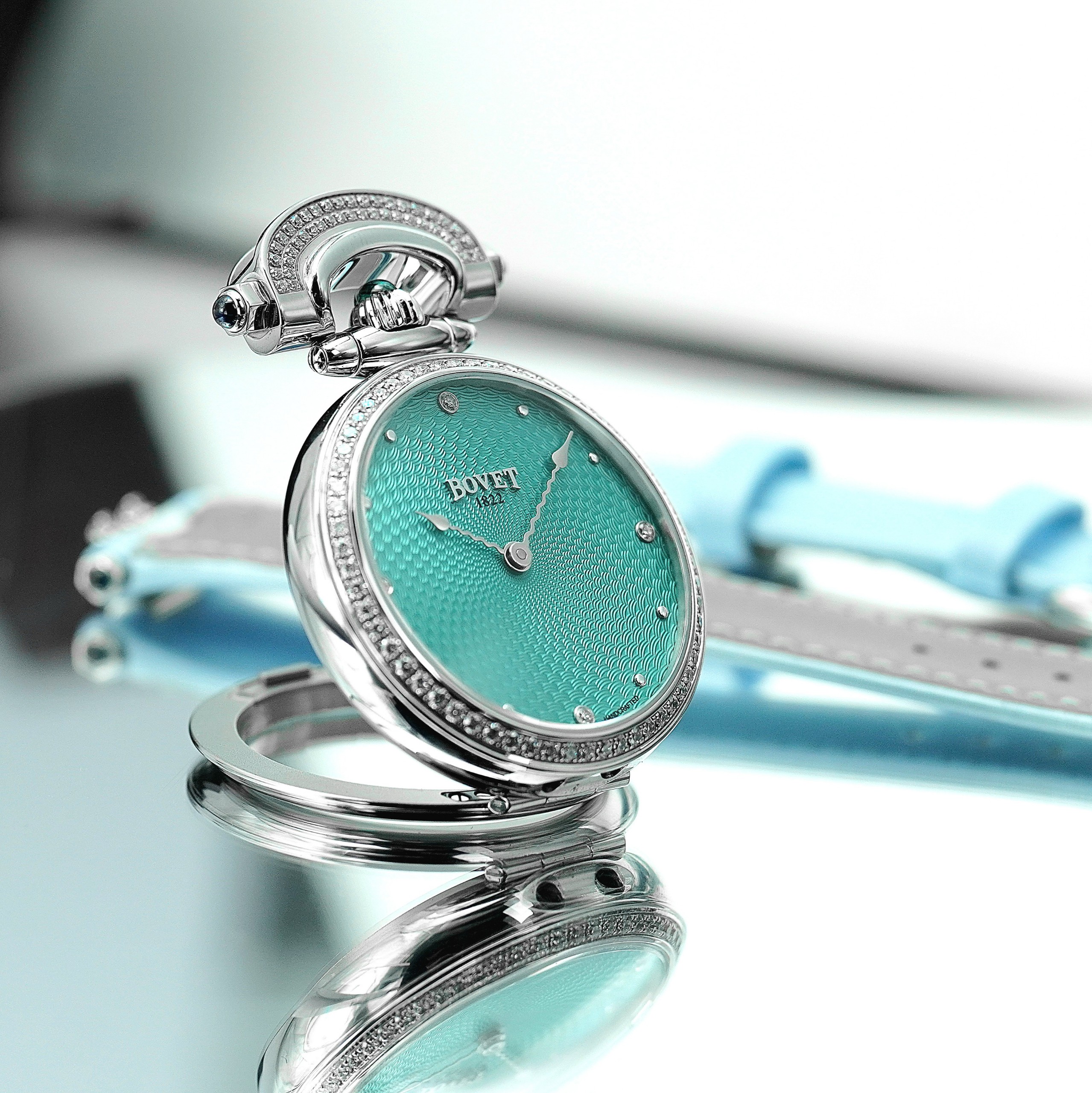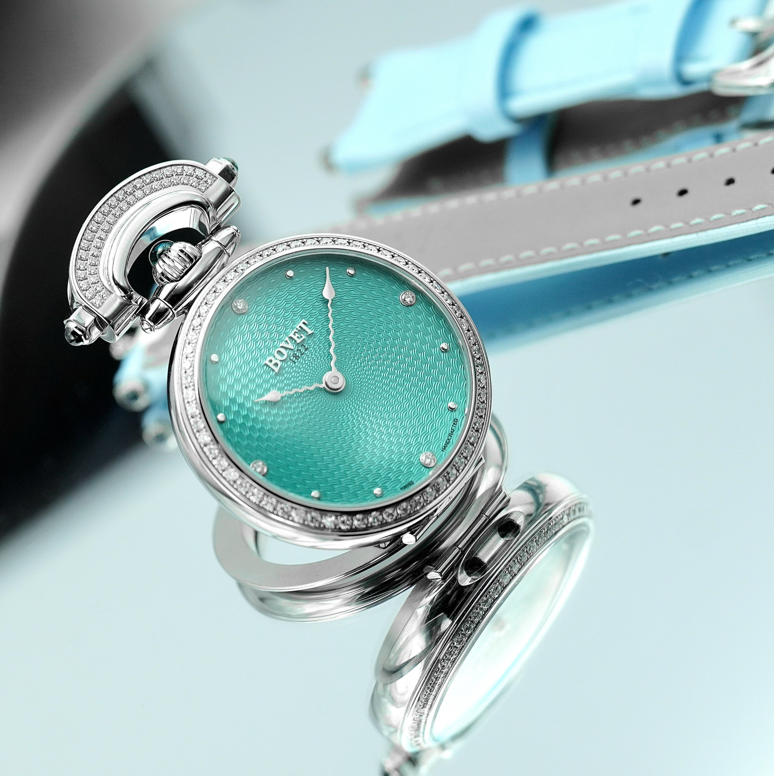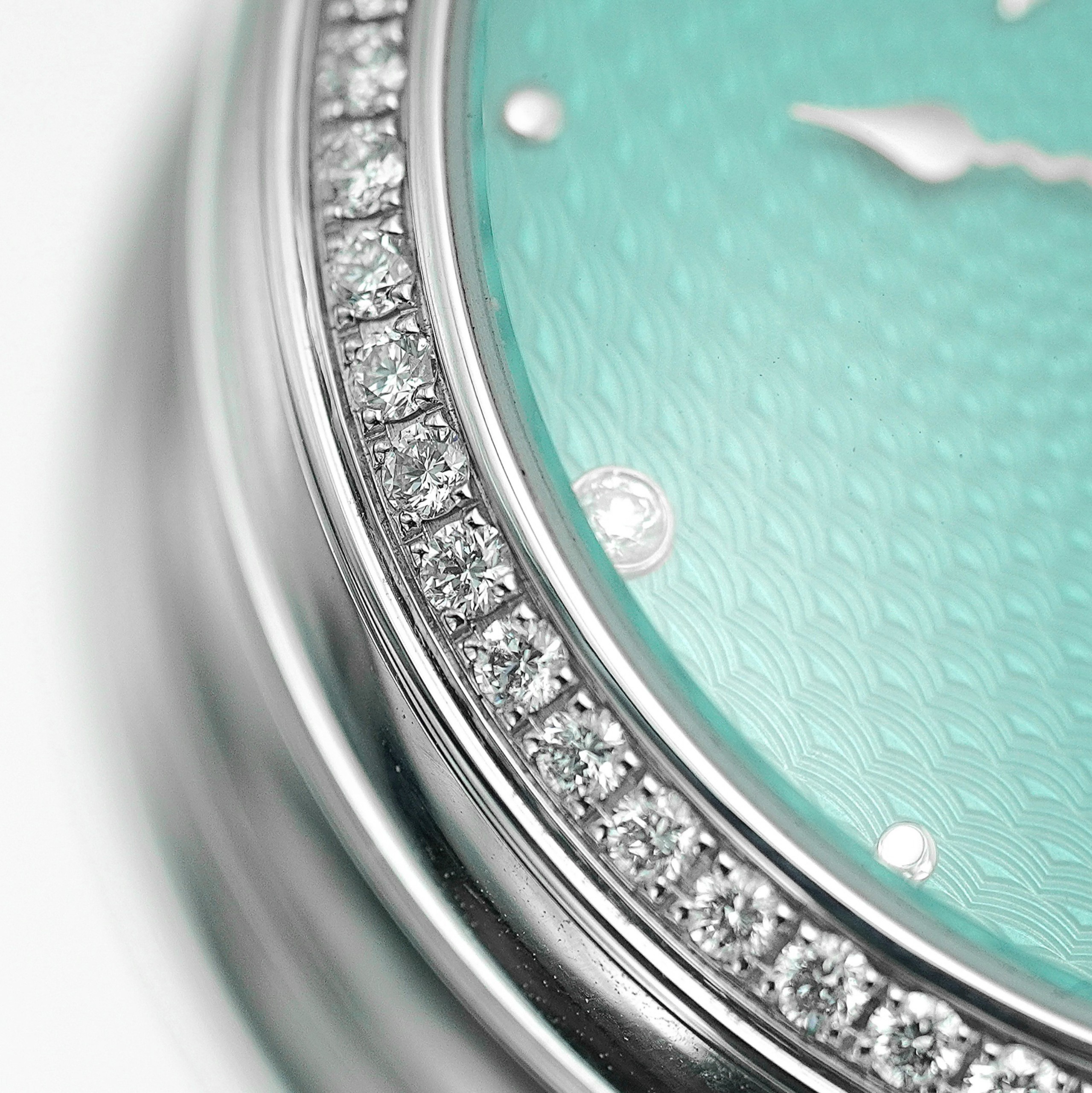 - Màu Sắc Mặt Số: Turquoise guilloché with 4 diamonds indexes