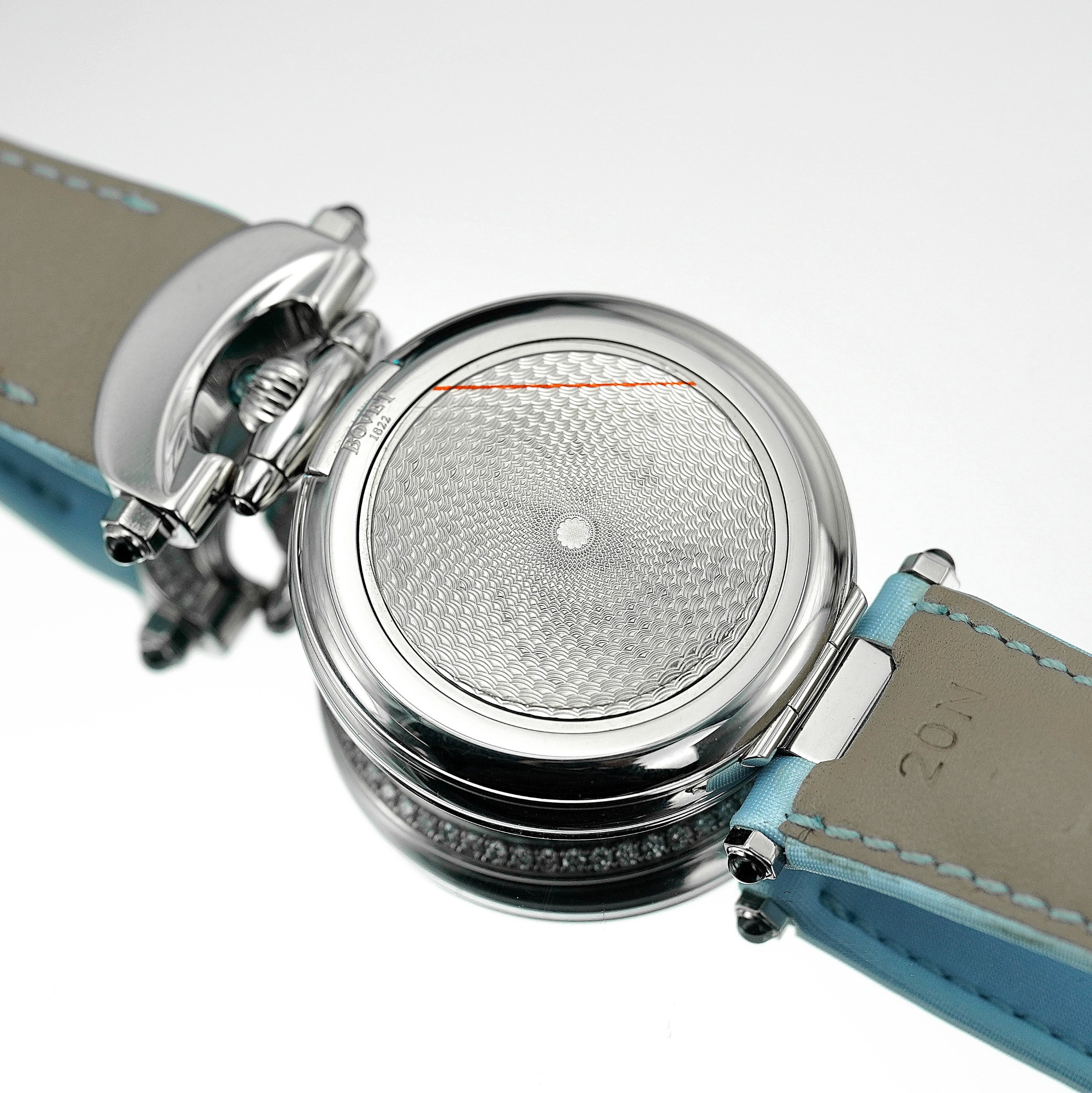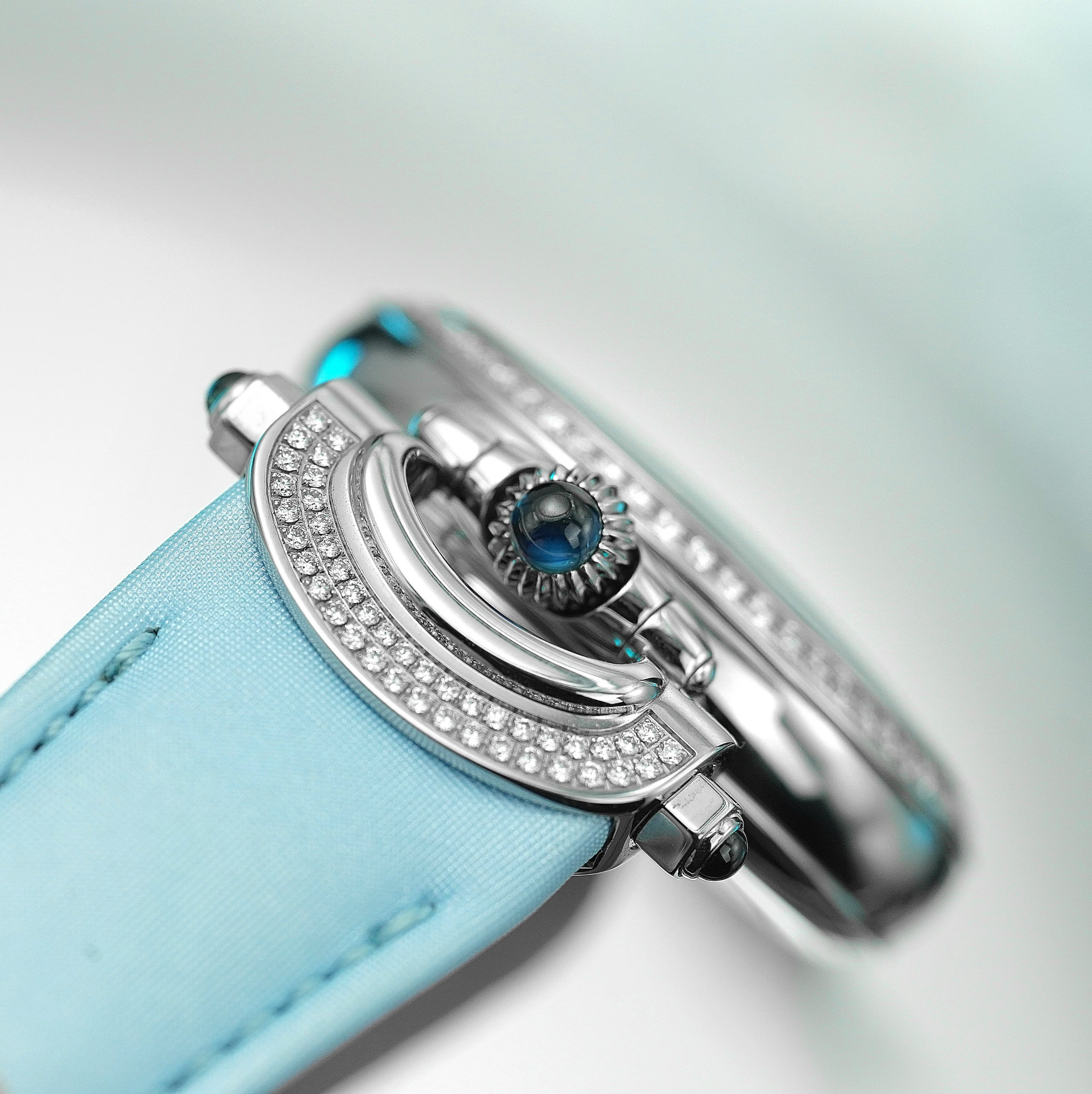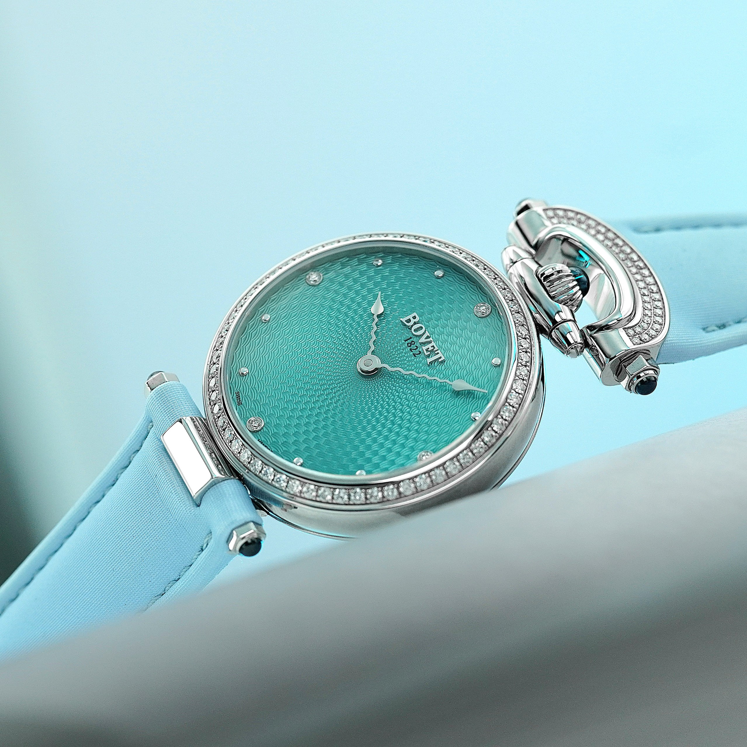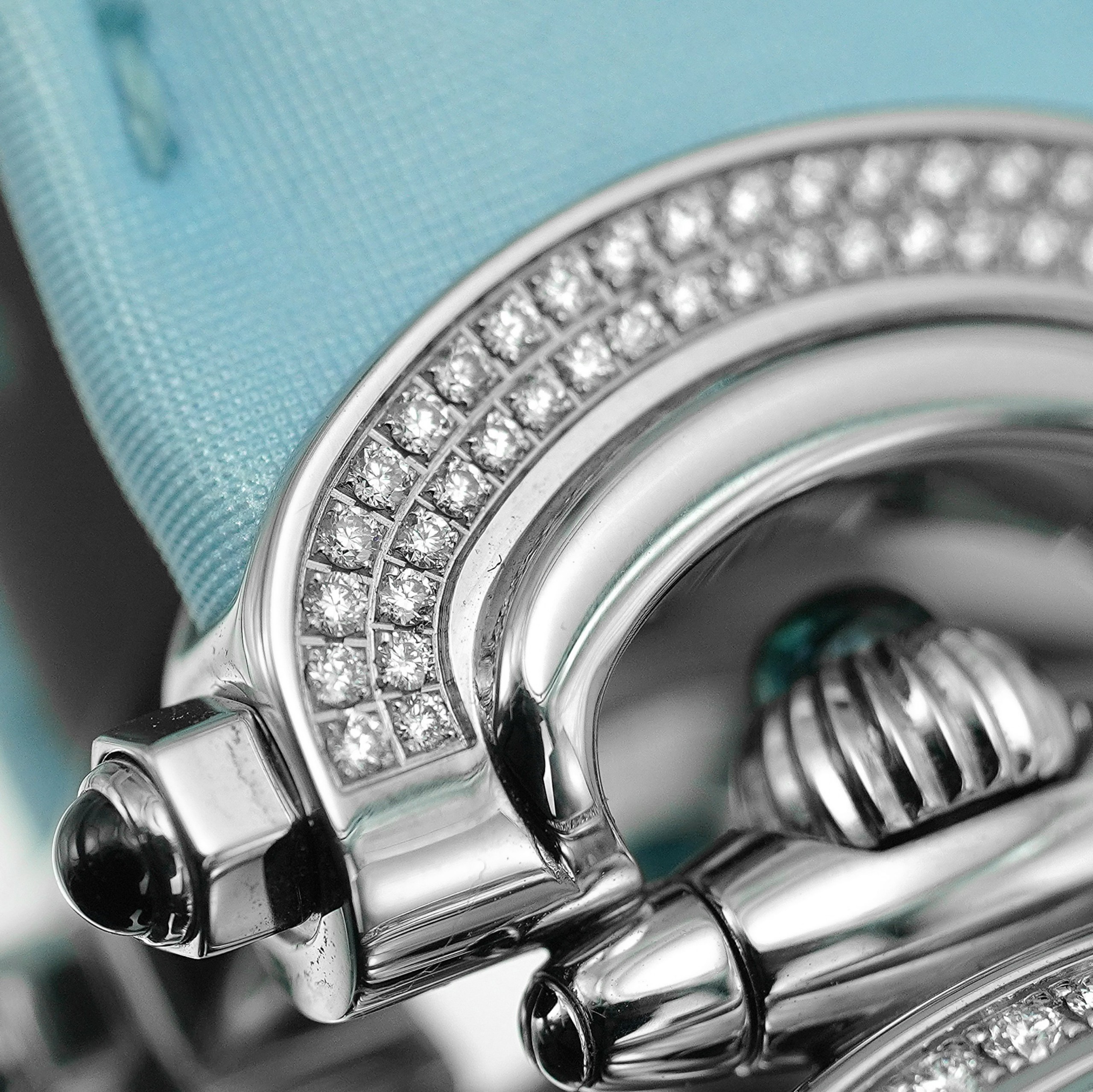 - Màu Sắc Mặt Số: Turquoise guilloché with 4 diamonds indexes