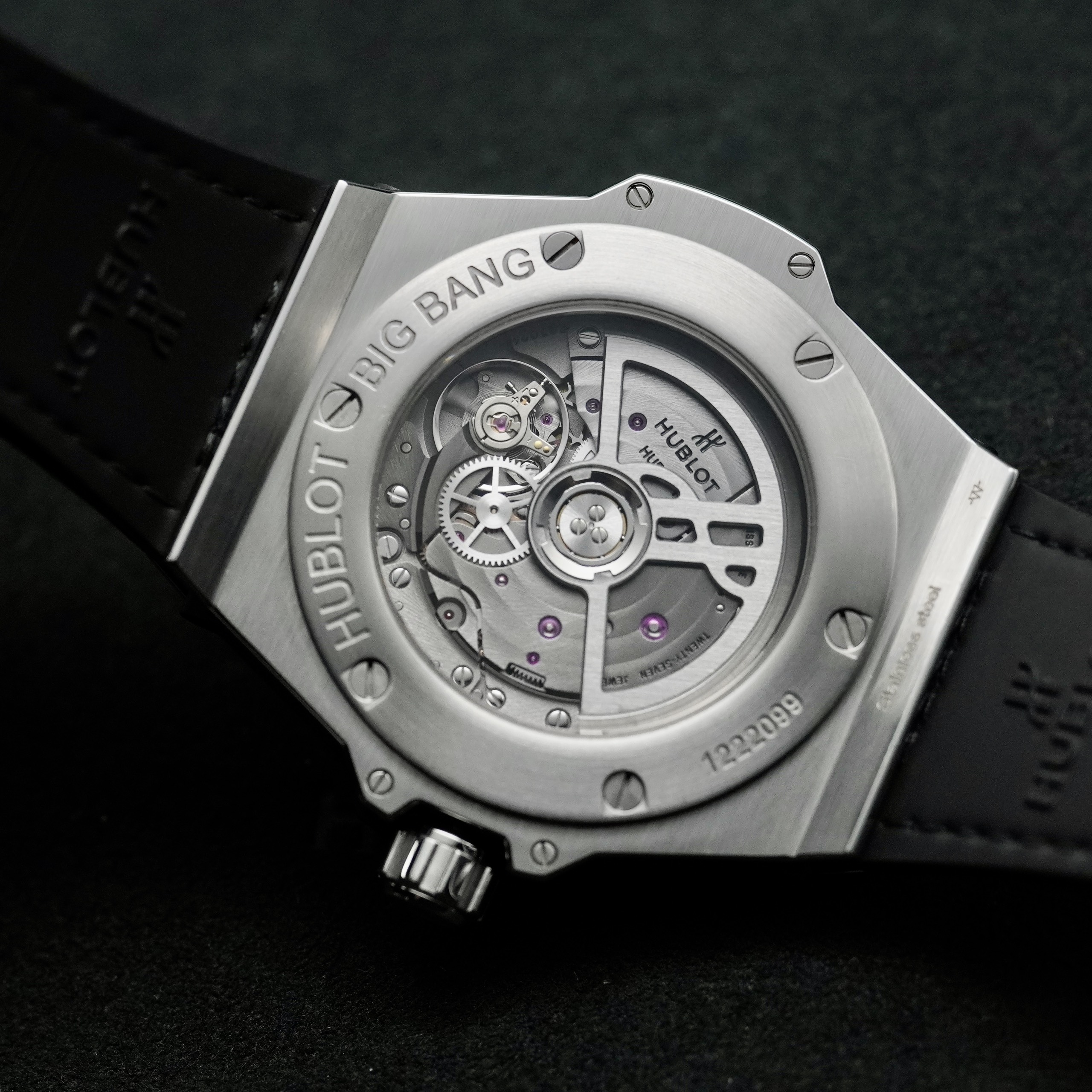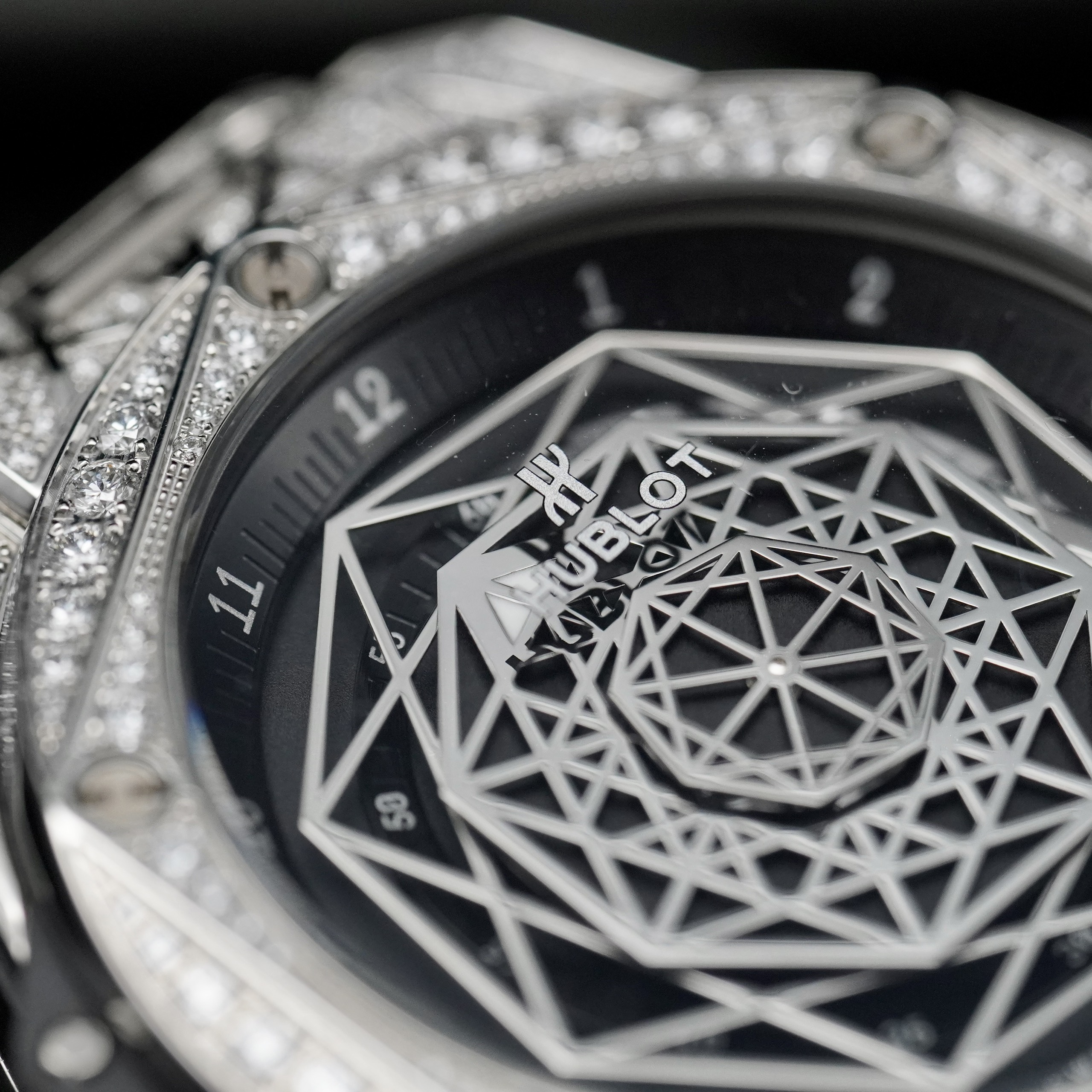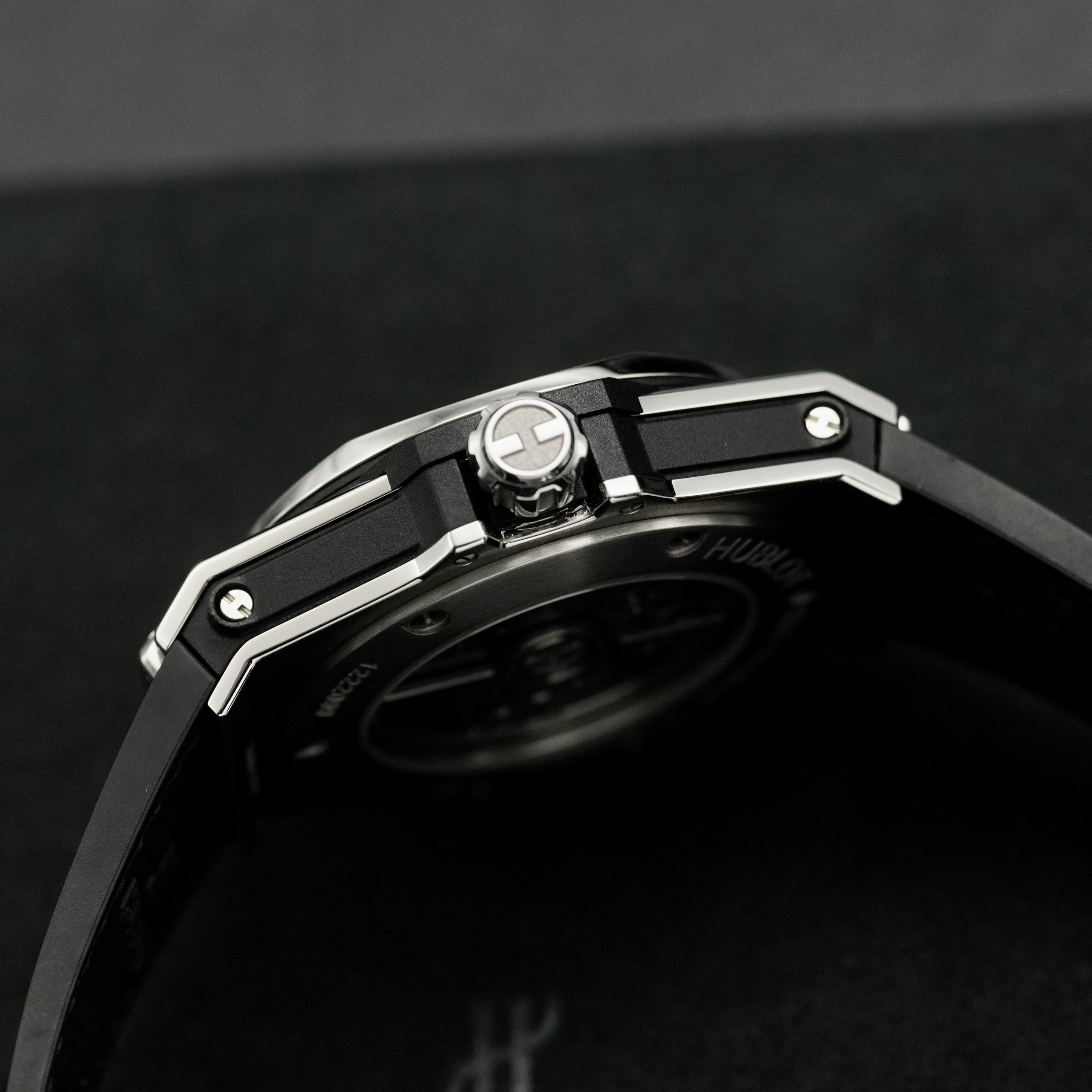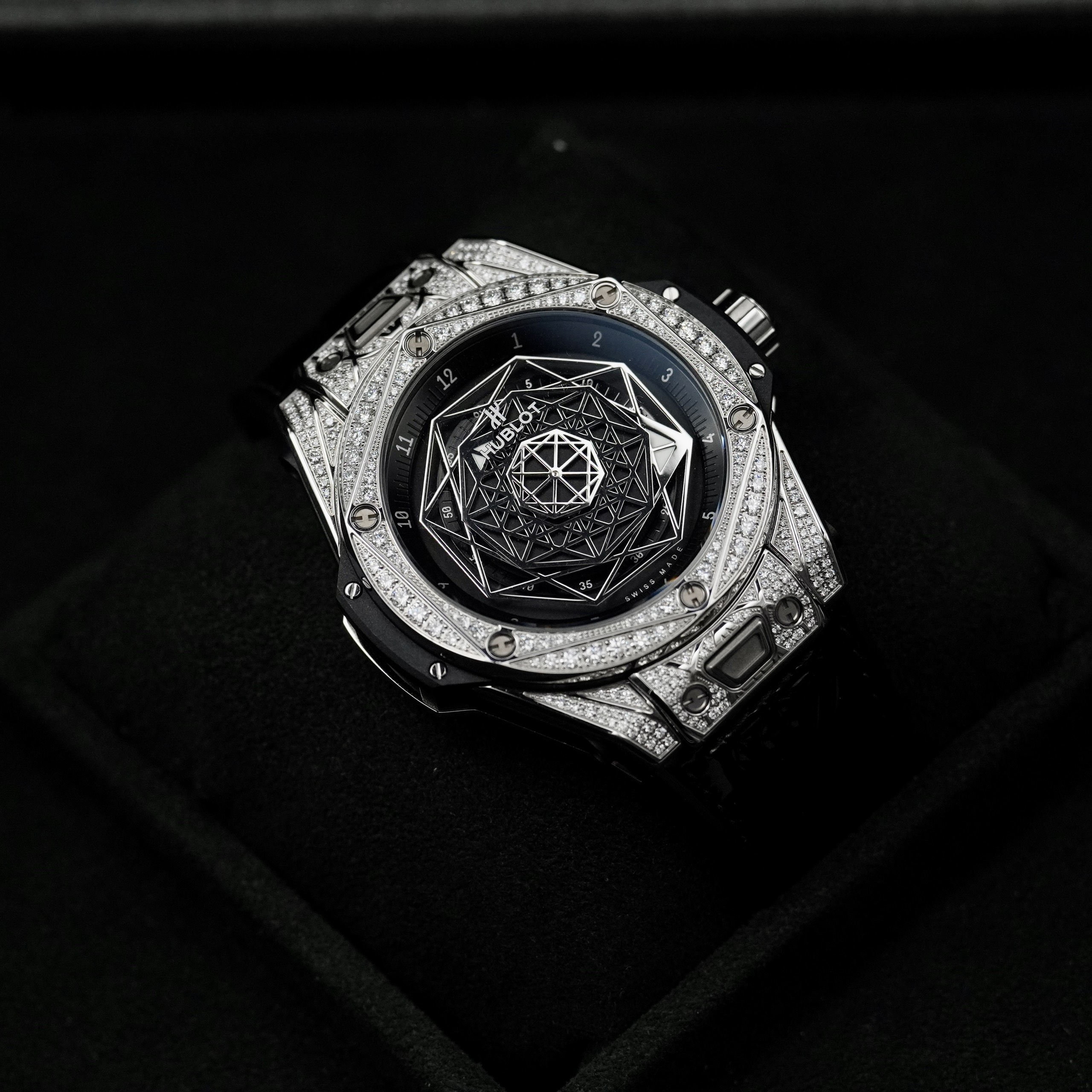 Mặt số: Mặt màu đen với thiết kế vô cùng độc đáo và mới lạ, đậm chất nghệ thuật đặc trưng của Hublot.